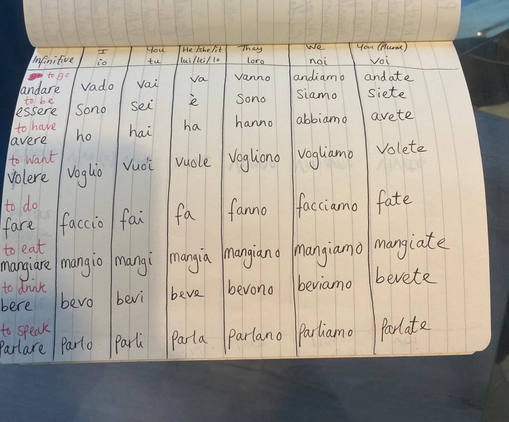 My starting point knowledge was pretty much food words (pizza, pasta, spaghetti, funghi, vino, al fresco, al forno, panini, focaccia, ciabatta, tortellini, formaggio and a few more) and basic greeting words from a brief trip to Lake Como in 2018 (grazie, prego, buongiorno, ciao, arrivederci, per favore) and that was basically all.