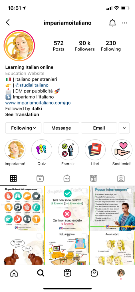 It’s a good idea to expose yourself to your target language as much as possible so a great way to do this is to follow social media pages as that means you’ll encounter the language daily even if you forget or don’t have time. You can follow pages which have been made specifically for learning the language or you can follow everyday pages intended for Italian speakers.