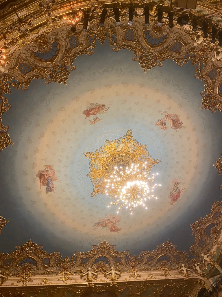 La Fenice is Venice’s opulent opera house, one of the most renowned venues for opera and classical music in all of Italy. Its name means ‘The Phoenix’, to honour the fact it rose from the ashes and was rebuilt three times after three devastating fires in 1774, 1836 and 1996. A golden phoenix hangs proudly above the stage under an incredible, vast ceiling painted with a blue-based fresco to resemble the sky. Blue is another favourite colour of mine and I especially love blue combined with gold, so I couldn’t stop staring at it the whole time we were in that room.