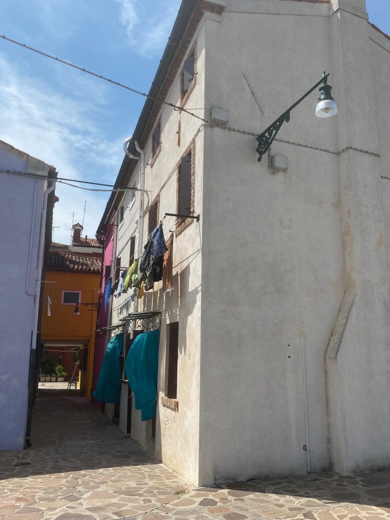 Where Murano is famous for its glass, Burano’s chief product is its intricate lacework which you would see wafting around on the breeze outside shops.