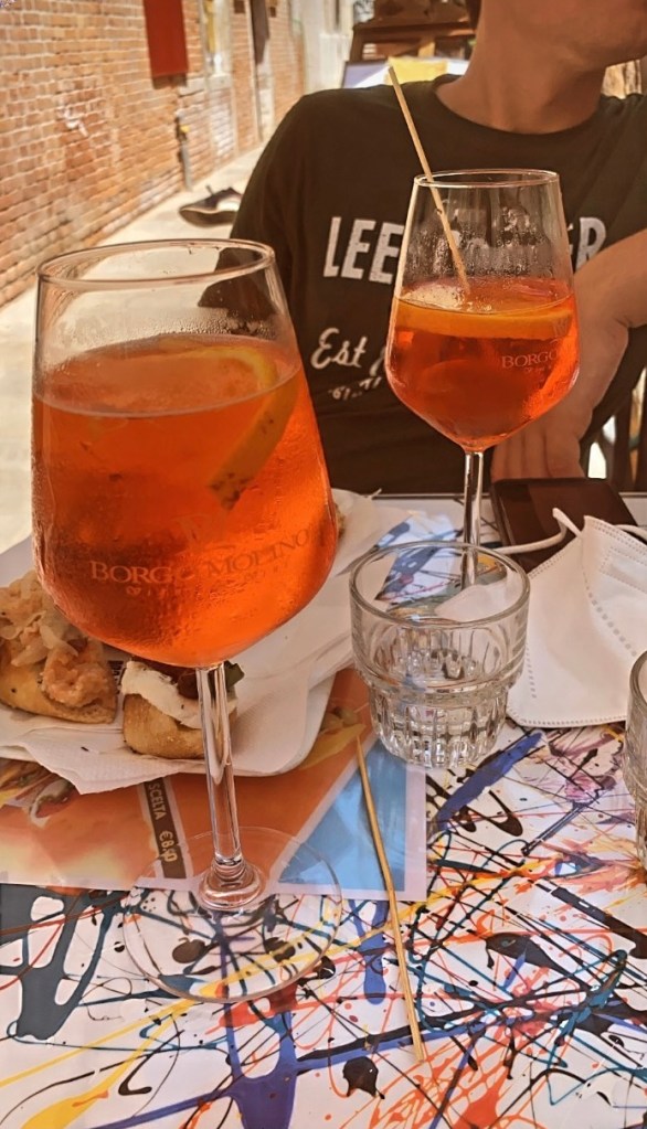 In Venice, their plural name for small snacks or sandwiches is cicchetti. This word can cause some confusion because in some other parts of Italy, it means alcoholic shots. We found a small bacaro on a side street just off one of the small bridges which was offering a spritz and three cicchetti for 8 euros per person and in the heat and humidity, the Aperol Spritz over ice went down amazingly. I wasn’t so sure about the olive they had placed in the drink.