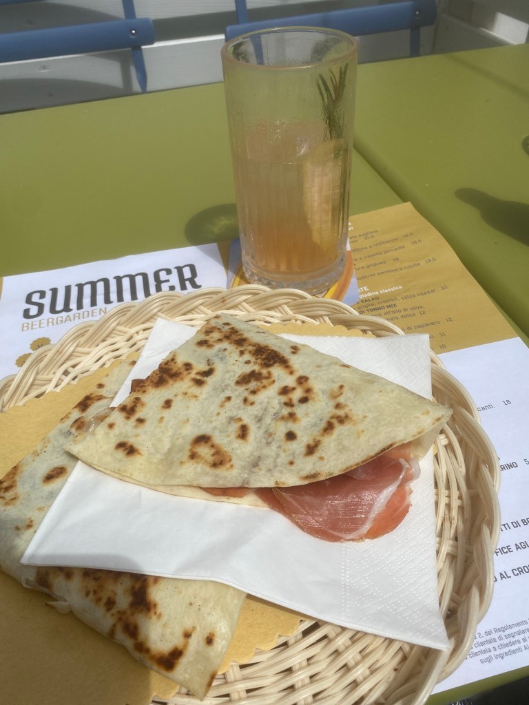 Rimini and Ravenna are both known for the piadina which is a kind of flatbread that you can fill with meat, cheese, and salad (the classic one contains scuaquerone, a liquidy milky cheese like the inside of a burrata, and rocket). The subtle difference is that a Rimini piadina is softer than the crispier Ravenna form. I took myself for one in the afternoon as I wasn’t allowed into the congress centre due to Covid restrictions on large gatherings. I ordered a piadina of prosciutto di parma and squacquerone with a fig jam along with a cocktail of Italicus bergamot and lemon liqueur and rosemary. There is just something about Italian flavours; the herbs, fruit, and botanicals, that is almost perfumed, in an edible way! They’re just light and beautiful and synonymous with summer.