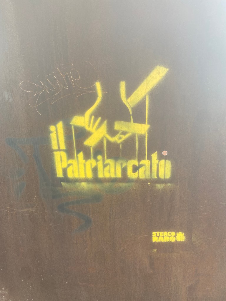 The next day, we went for a long walk around Rimini and there isn’t much in terms of remarkable monuments etc, but it has a nice relaxed vibe: gelato shops and flowers everywhere and a cute Sunday antique market. It seems a wealthy area, and so I was a bit surprised but also pleased to see this piece of sprayed-on graffiti art illustrating the power and control of the patriarchy (for all genders).