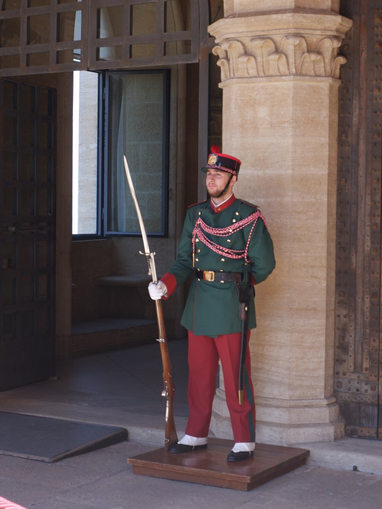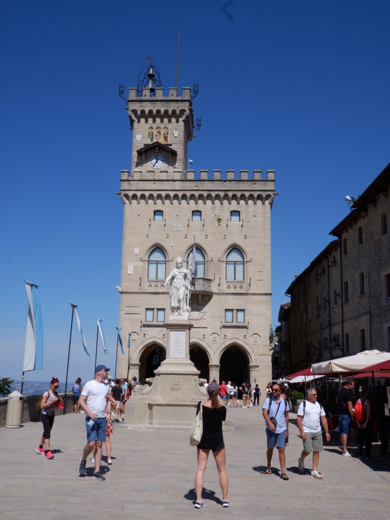After lunch, we walked along the main streets to the Piazza della Libertà and saw the Palazzo Pubblico, San Marino’s town hall and official government building. It looks so medieval, topped with a battlement, but this version was built in the 19th century. The guards are dressed smartly in green and red uniforms and hats. Children tried to get them to smile or talk back to them but they remained profesionally still at all times.