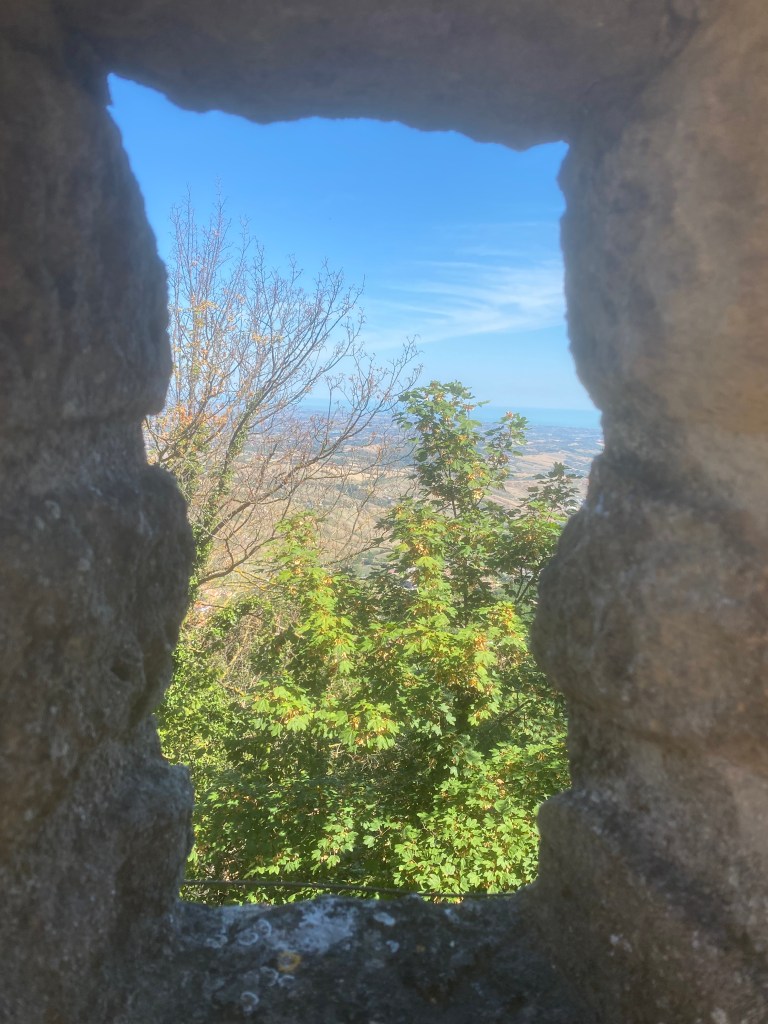 One of the San Marino towers framed the view, and a couple asked Andrea to take a picture of them kissing.