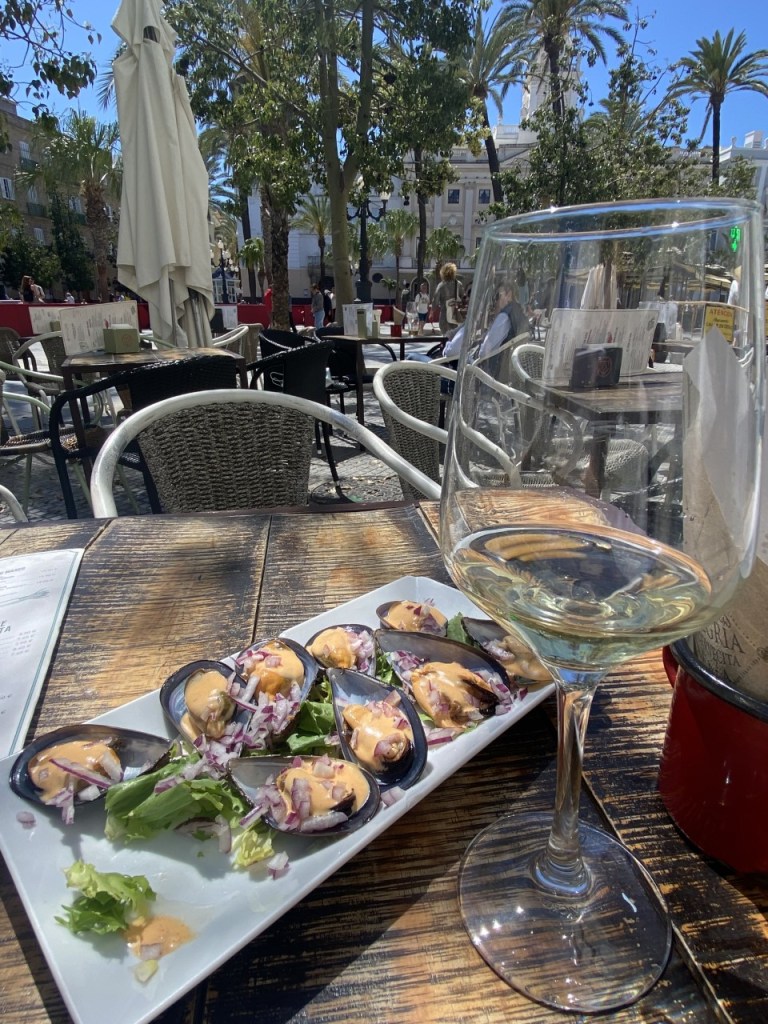 In the end, I made my way back to the central square of Cádiz where the Ayuntamiento building is (town hall) which I had tried to avoid due to recalling poor quality food at inflated prices when I first visited in 2016. I sat down at a Volapié and ordered a plate of mejillones in a salsa picante which were surprisingly good, tasting of the sea and a hint of spice sitting in their pearlescent black shells along with a chilled glass of verdejo.