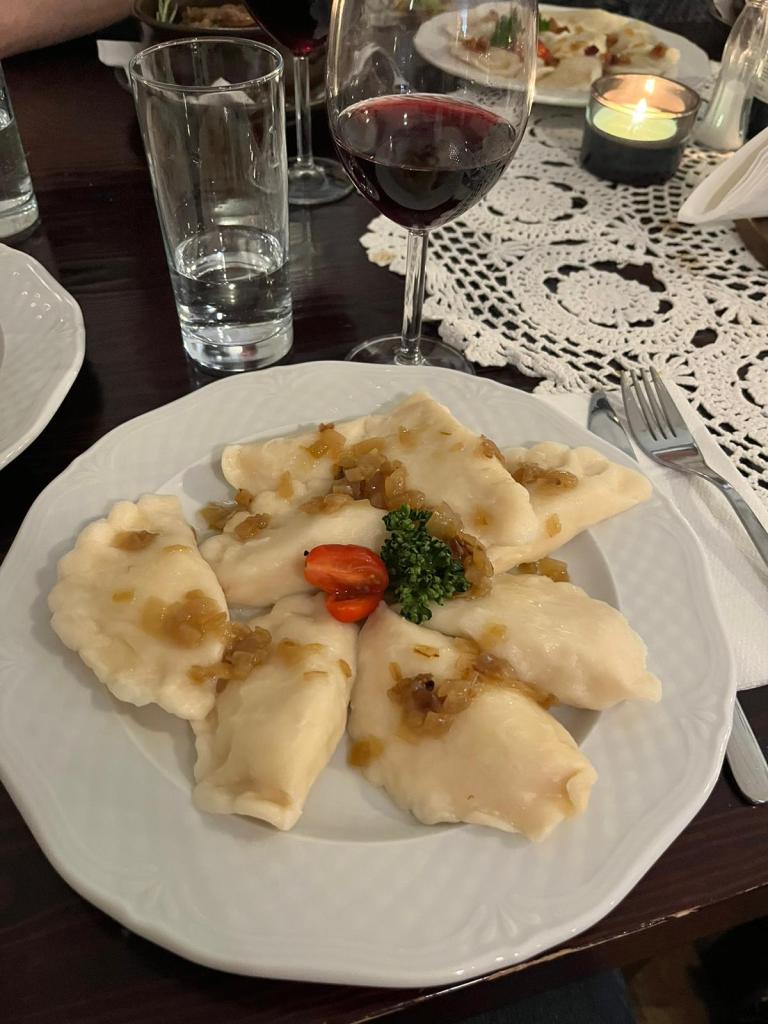 We shared a good bottle of Polish red and a starter of pierogi: