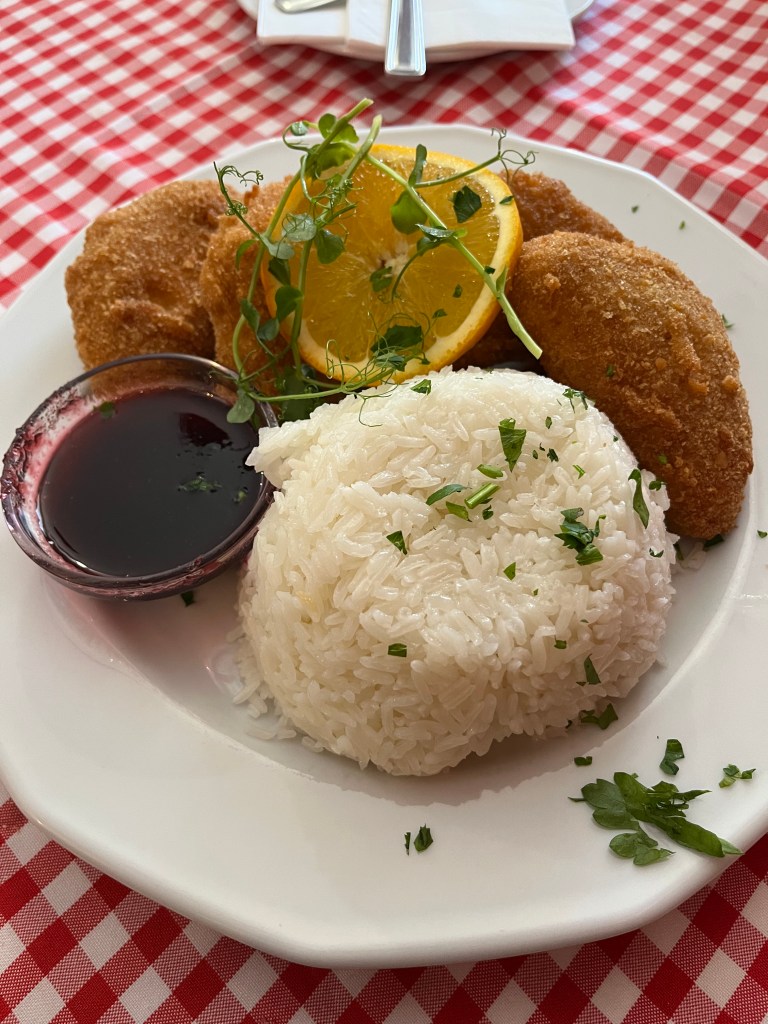 I felt intimidated when it came out: five large pieces of deep fried cheese accompanied by cranberry sauce and a superfluous mound of rice all topped with a slice of orange.