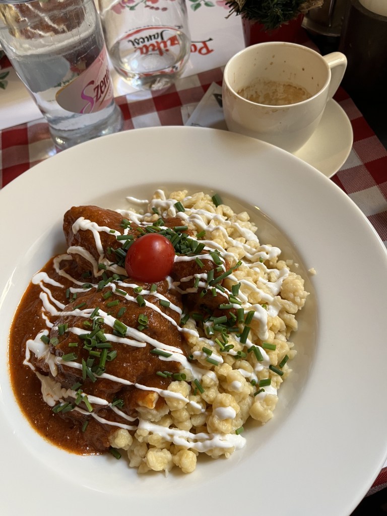 Luke and I both opted for a pörkölt (stew), a dish made often by Luke’s mum. Chicken in a rich paprika sauce topped with chives and sour cream with a generous serving of galuska (dumpling noodles known as spätzle in German-speaking regions of Europe) was perfect for a chilly early afternoon which we consumed with two double espresso which was like an injection of rocket fuel to the system!