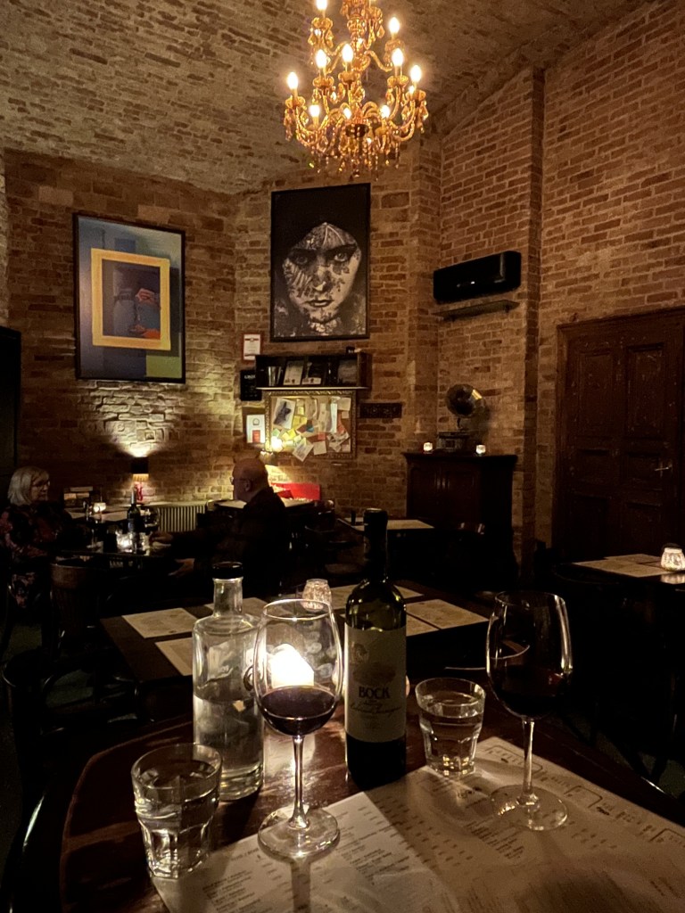 Luke had discovered a wine bar in the Jewish district called Doblo and we had a table booked for 7pm. The waitress knew about all the wines on the list, all Hungarian, and recommended a red from Villány in the south of Hungary which was a delight. We also ordered a Hungarian charcuterie board of local cheeses and meats which obviously went down well with the wine!
