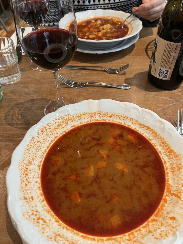 As we expected, the food and wine was beautiful. We chose a bottle of Syrah because it had the name János after our granddad in it and serendipitously, its spiciness paired very well with our gulyásleves (goulash soup). The goulash was stunning, far, far better than portrayed in the picture. It was a rich velvet red colour bursting with flavour, an ideal winter warmer on a day colder than the one before.