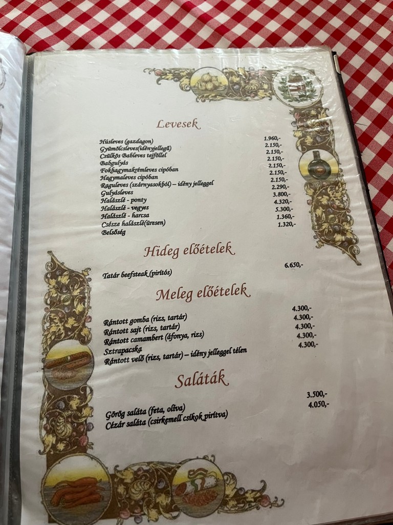 We felt out of place and at home all at once, such is the familiarity of several dishes, ingredients, scents, words, names and more to us but also grappling with the impenetrable language on the menus: (massive respect to anyone who learns and becomes fluent in Hungarian! I tried when I was 19 and bought a dictionary that my dog George chewed; I believe it is what lead me later to learning Spanish and Italian).
