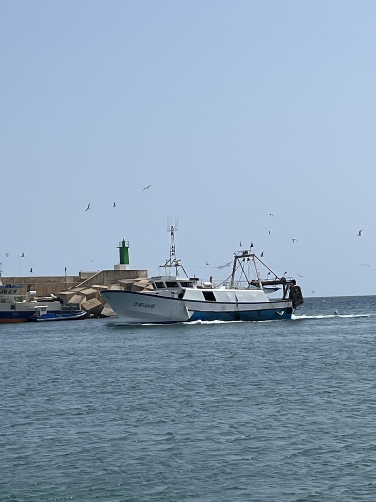 I headed all the way down to the fishing port at Platja Centro to see the fishing boats return to shore after a long day at sea, starting to dock around 16:30; boats sail in encircled by seagulls (gaviotas in Spanish) then the fishermen disembark and haul their nets in filled with silver slithering fish ready for auction.