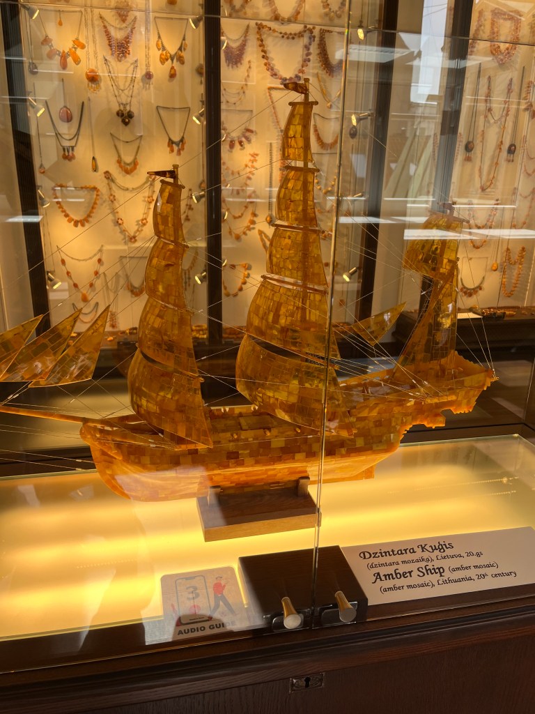 Upstairs, across three floors, is the amber museum. The entry ticket is 5 euros and the lady gave me a book in English written by the owners of Amber Queen with lots of information on the Baltic history of amber and on their exhibits dating back a couple of centuries with items from hand mirrors to clocks to ships.