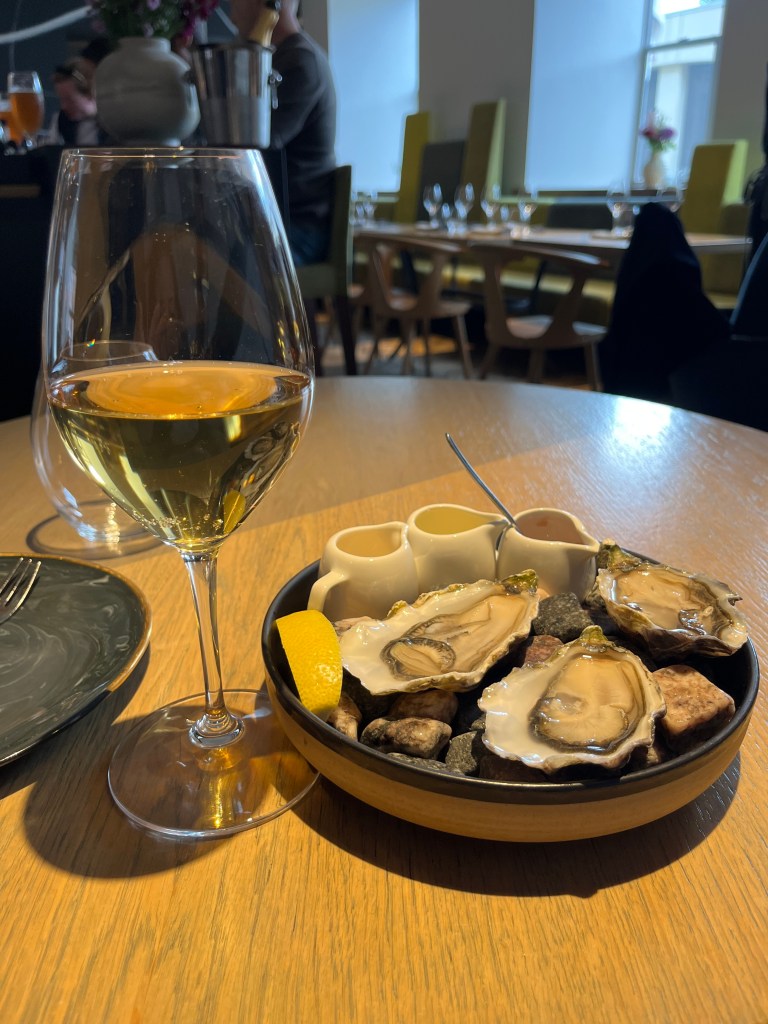 My starter was Irish oysters with red wine vinegar and shallots, sake and another white vinegar with a surprising glass of Latvian sparkling wine: