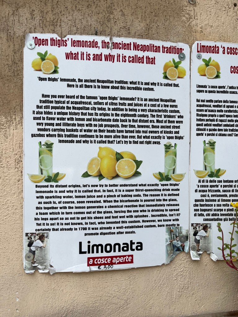 You can never go thirsty around these parts with soft drinks on carts, spritz in plastic cups for 1 euro (don’t be deceived by their small size, the ratio is strong!), espresso bars on every corner and most curiously, stalls vending fresh lemon juice mixed with bicarbonate of soda, called ‘Limonata da cosce aperte’ – lemonade with thighs apart. Allow me to explain…