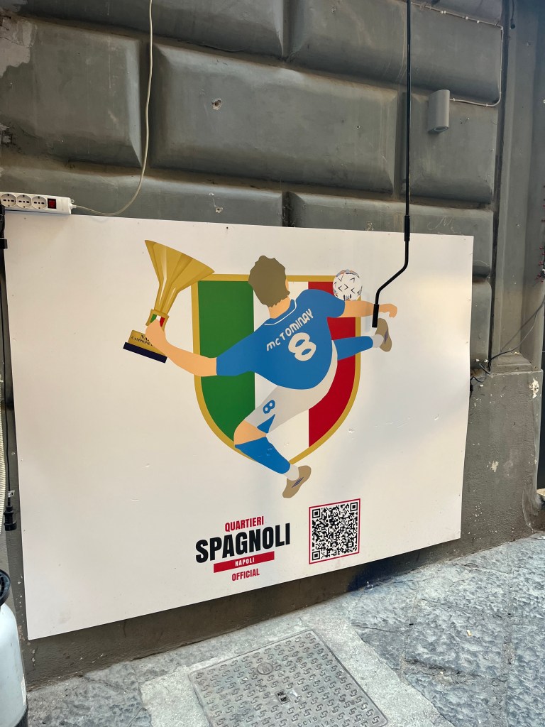 The Neapolitan people are passionate about their team, and Maradona is so revered due to the success and pride he brought to the people. Napoli football shirts are available from numerous shops in the Quartieri Spagnoli, and flags, bunting and other regalia hang from balconies and windows alongside the laundry of residents, fluttering in the breeze reminiscent of a Moroccan medina.